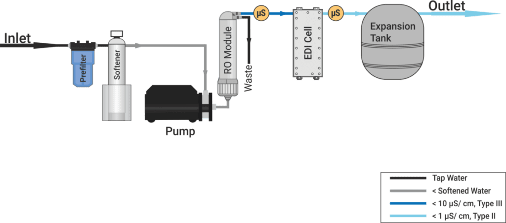 Das Fließschema zeigt den Aufbau einer HA-RO cube large EH EDI. Der nachgeschaltete Druckausgleichsbehälter sorgt für einen weitgehend konstanten Druck über den dann das aufbereitete und gespeicherte Wasser an den Abnehmer (z. B. Laborspüler, Autoklav, Desinfektionsgerät, Reinstwassersystem) kontrolliert abgegeben werden kann.
