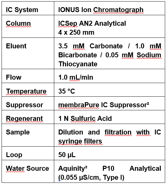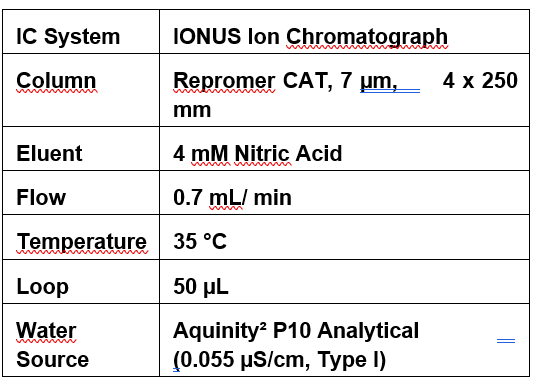 Unser Ziel war es, die Fähigkeit unseres IONUS-Ionenchromatographen zu bestätigen, diese Anwendungen gleich oder besser als die in den Methoden vorgeschriebenen durchzuführen. Einige dieser Methoden wurden vor mehr als 30 Jahren veröffentlicht. IC-Systeme, IC-Säulen und die Software für die Gerätesteuerung und Datenauswertung haben sich erheblich verändert, obwohl einige der Methoden diese Verbesserungen nicht widerspiegeln.
