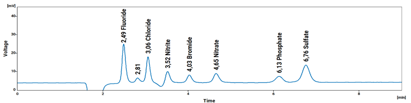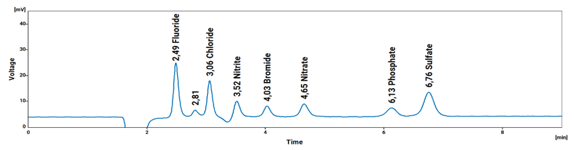 Der IONUS Ionenchromatograph ist ein robustes System, das sich ideal für die Analyse der vorgeschriebenen Anionen, Kationen, Ameisensäure und Iodid eignet, wie in den untenstehenden Chromatogrammen (Abb. 1 bis Abb. 4) dargestellt.