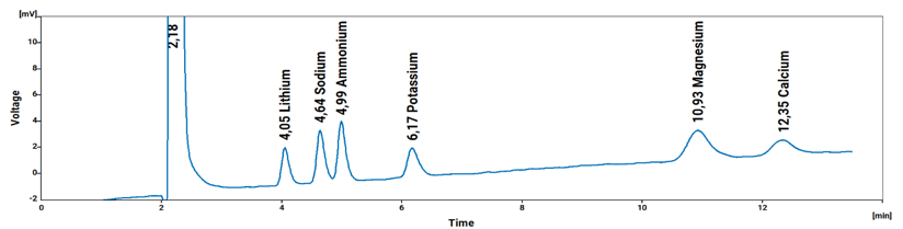 Abb. 3: Das Chromatogramm zeigt die Auflösung von Ammonium und Natrium mit einer Konzentration von jeweils 5 ppm.