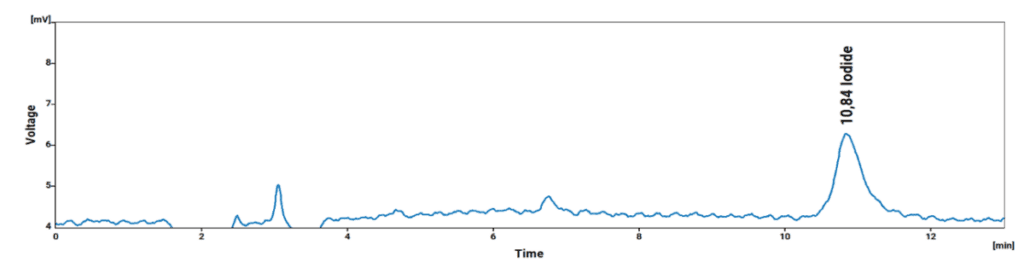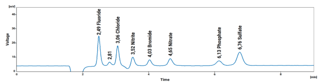 The IONUS Ion Chromatograph is a robust system ideally suited for the analysis of the prescribed Anions, Cations, Formic Acid, and Iodide as shown in the chromatograms (Fig. 1 to Fig. 4) below.