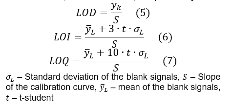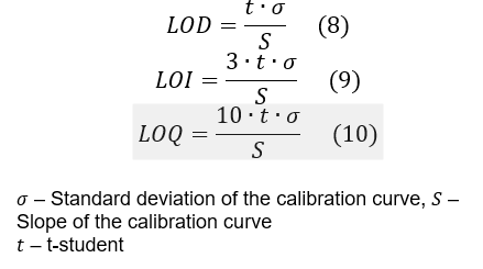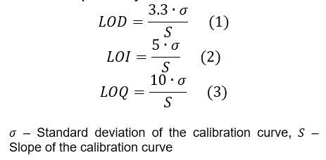 - Apply formulas (8), (9) and (10) to calculate the LOD, LOI and LOQ, respectively.